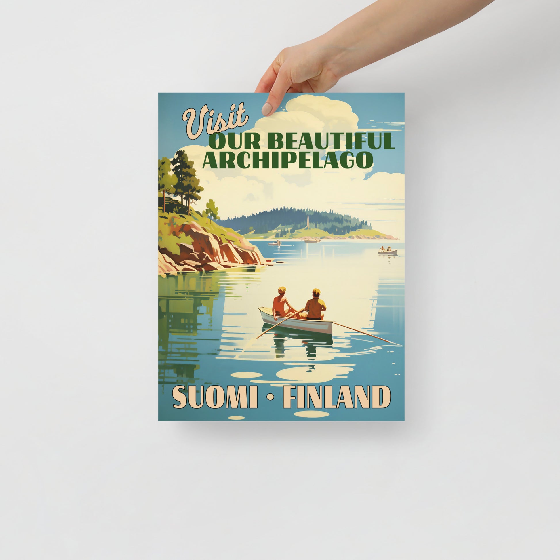 Vintage-tyylinen matkailujuliste Suomen kauniista saaristosta. Juliste on tulostettu paksulle, laadukkaalle ja kestävälle mattapaperille.