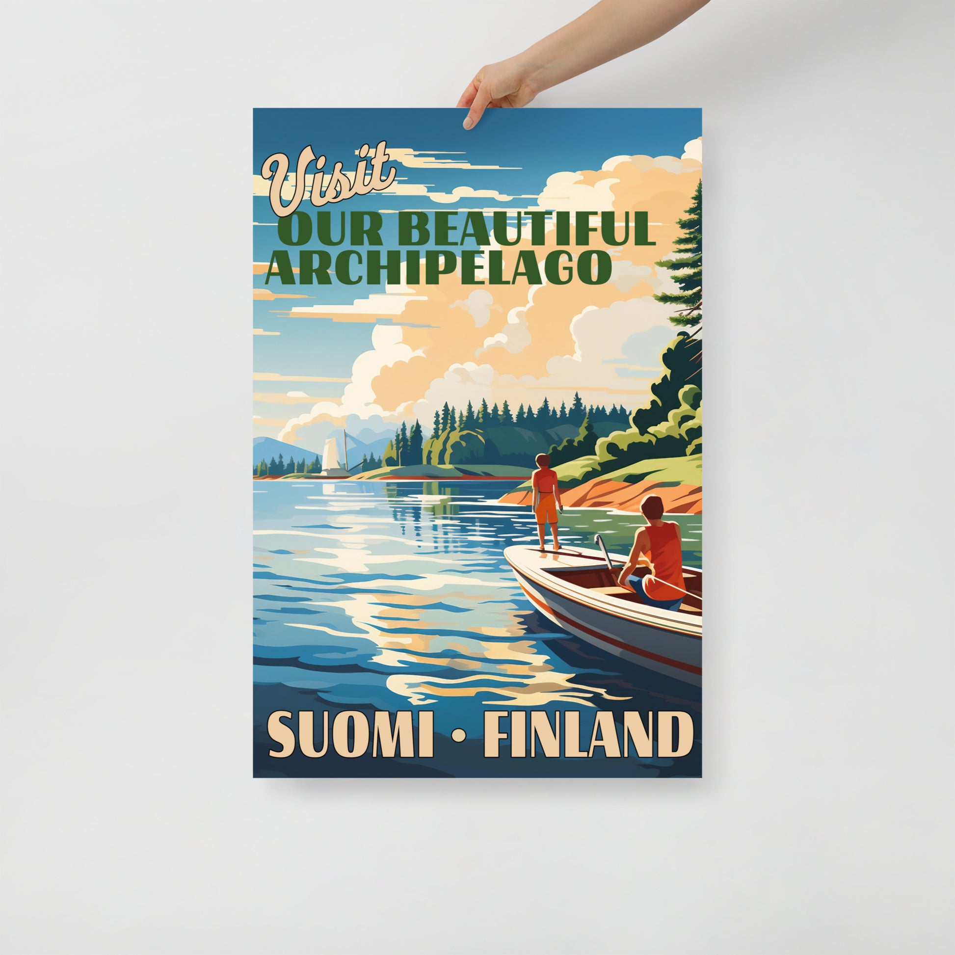 Vintage-tyylinen matkailujuliste Suomen kauniista saaristosta. Juliste on tulostettu paksulle, laadukkaalle ja kestävälle mattapaperille.