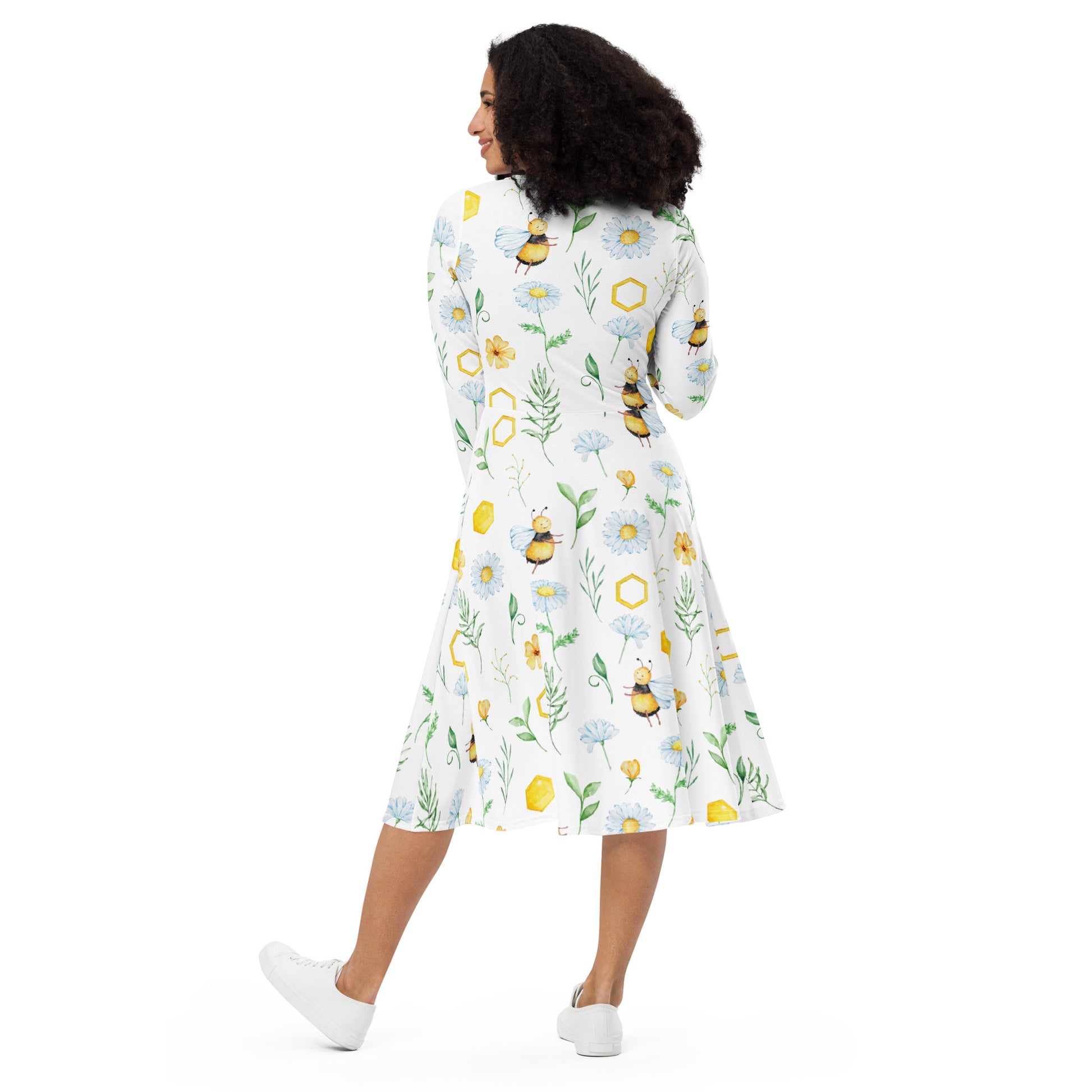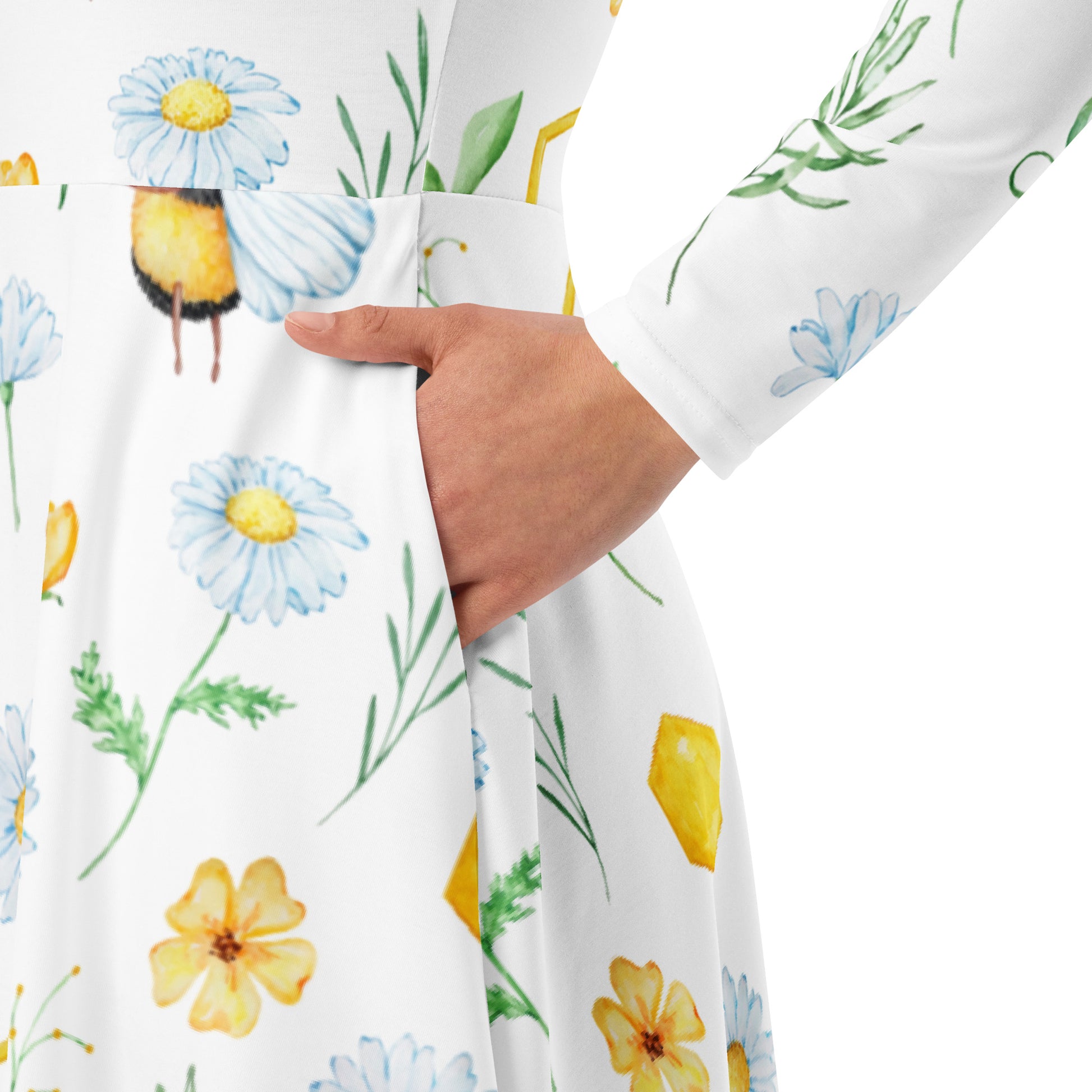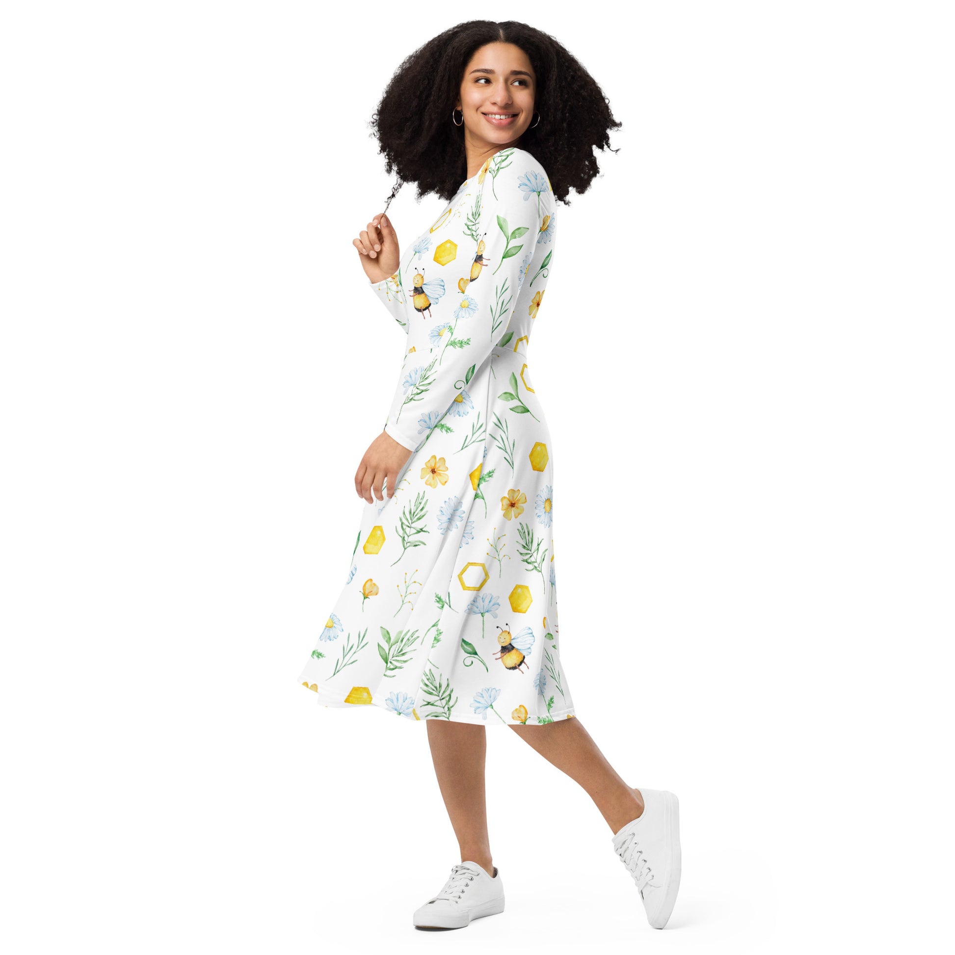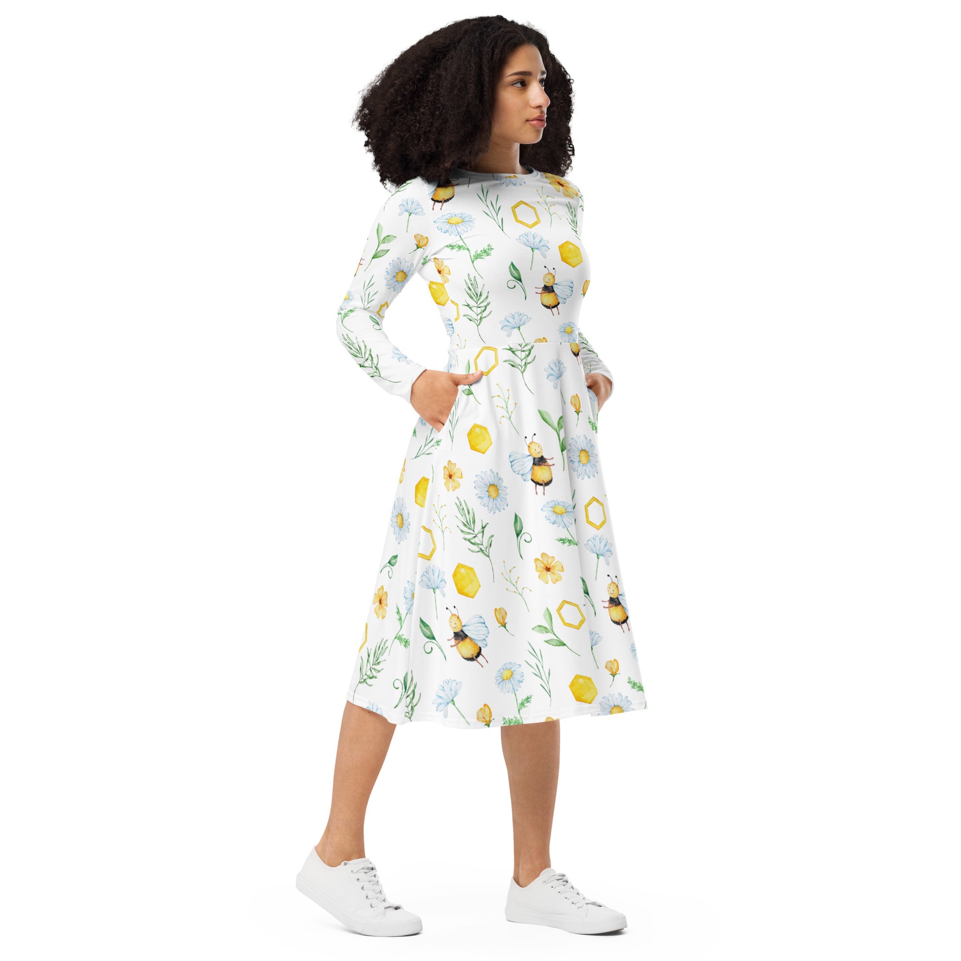 En klänning med långa ärmar OCH fickor? Ja tack! Denna långärmade midiklänning med all-over-tryck är en showstopper för alla som älskar att bära klänningar. Klänningen har en bekväm men ändå smickrande siluett eftersom den sitter i midjan och har en utsvängd nederdel. Styla den för en tjusig dag ute eller klä dig för en mer avslappnad look.