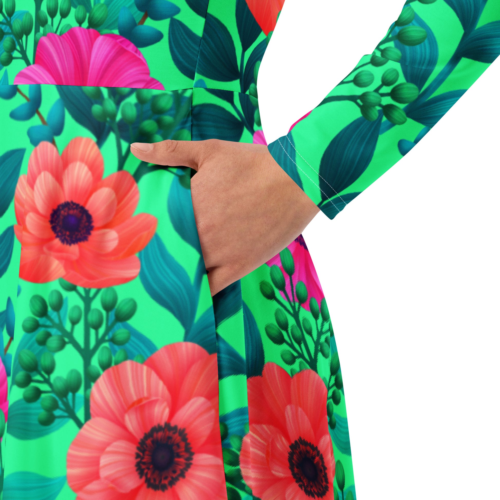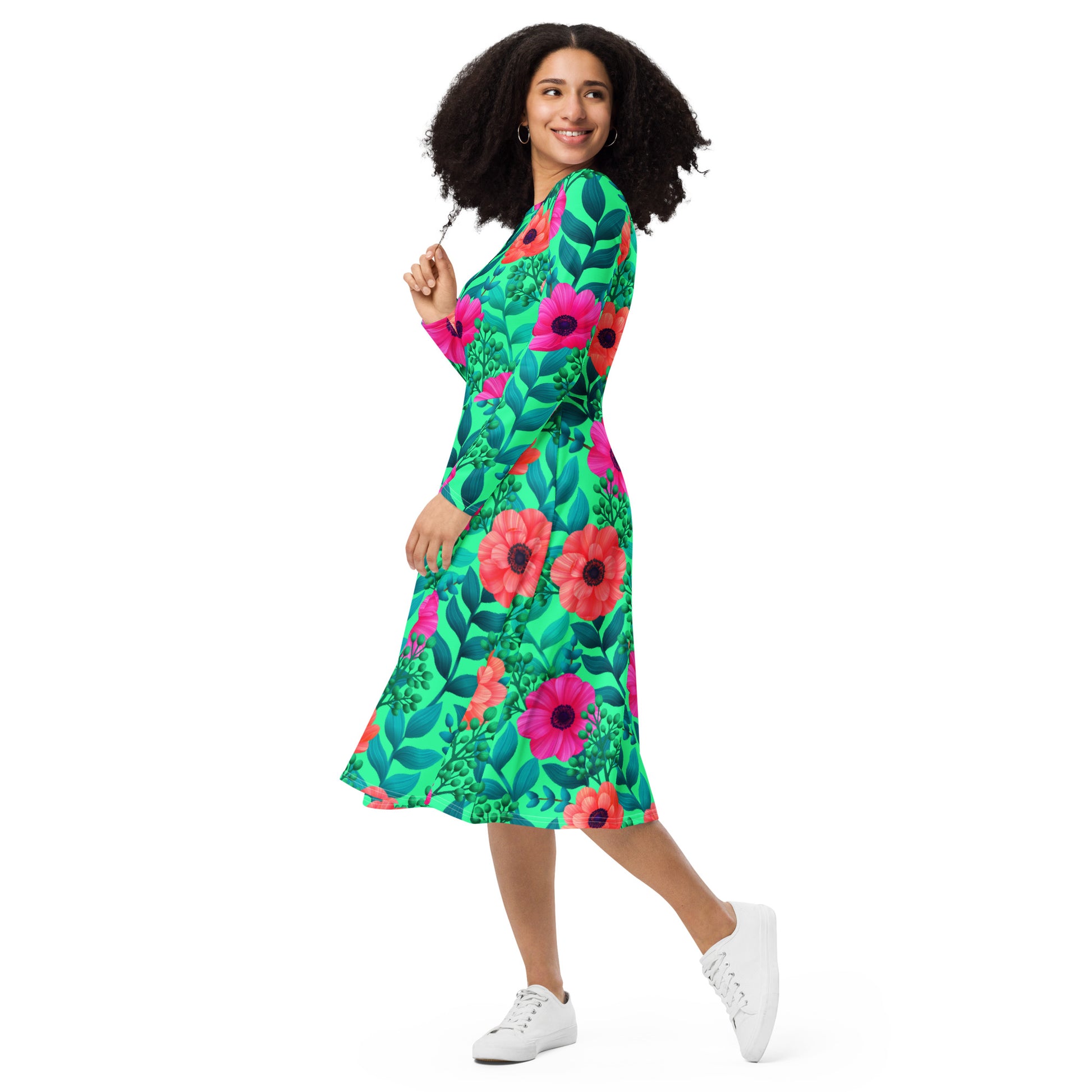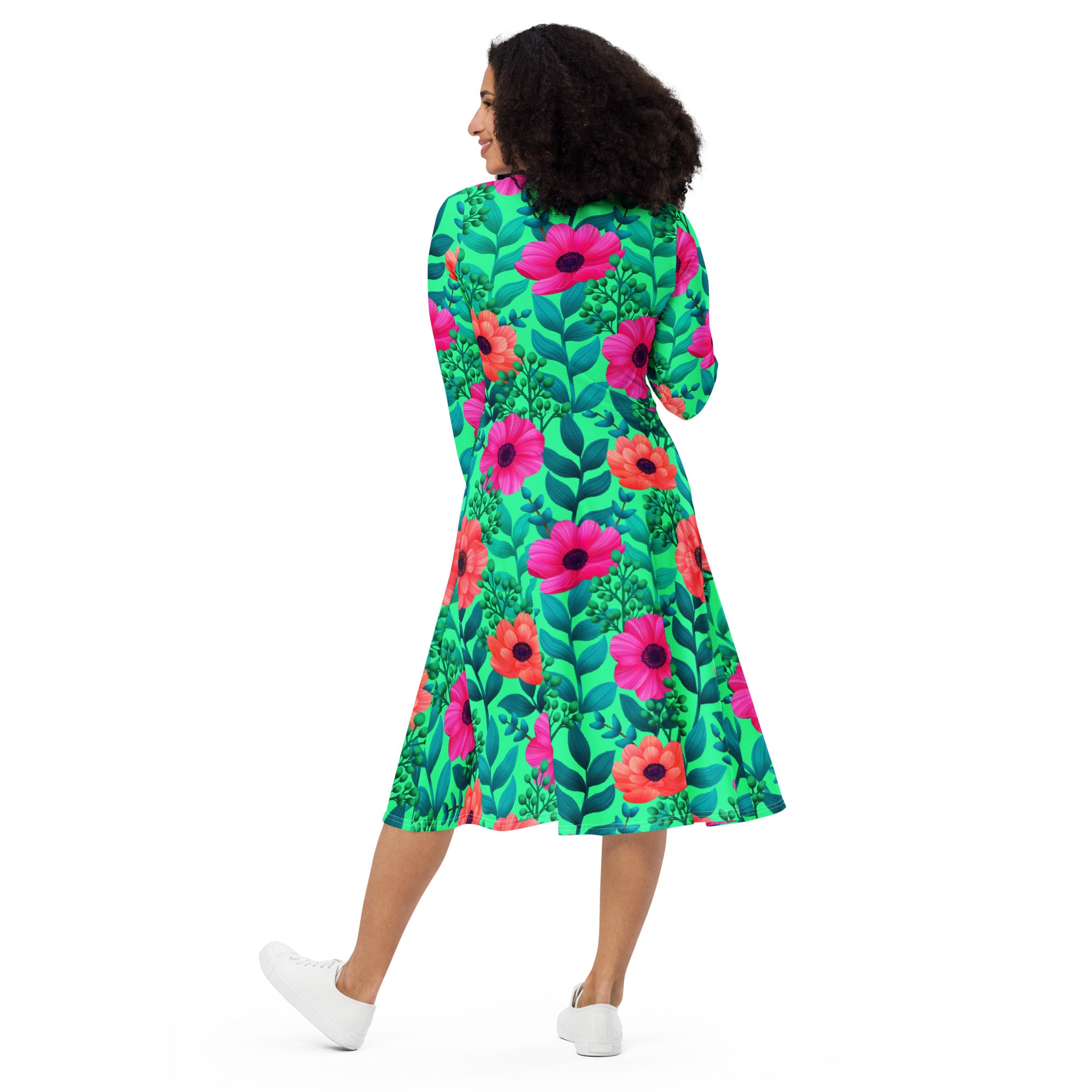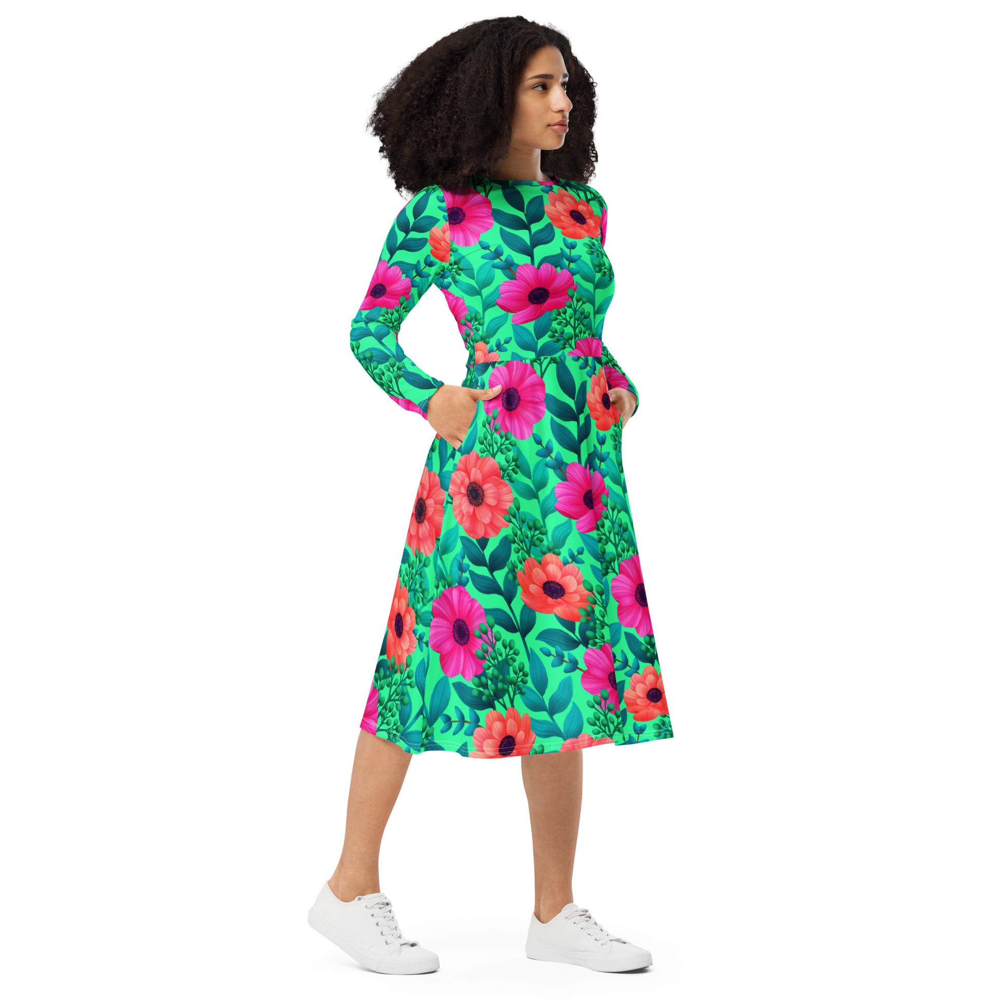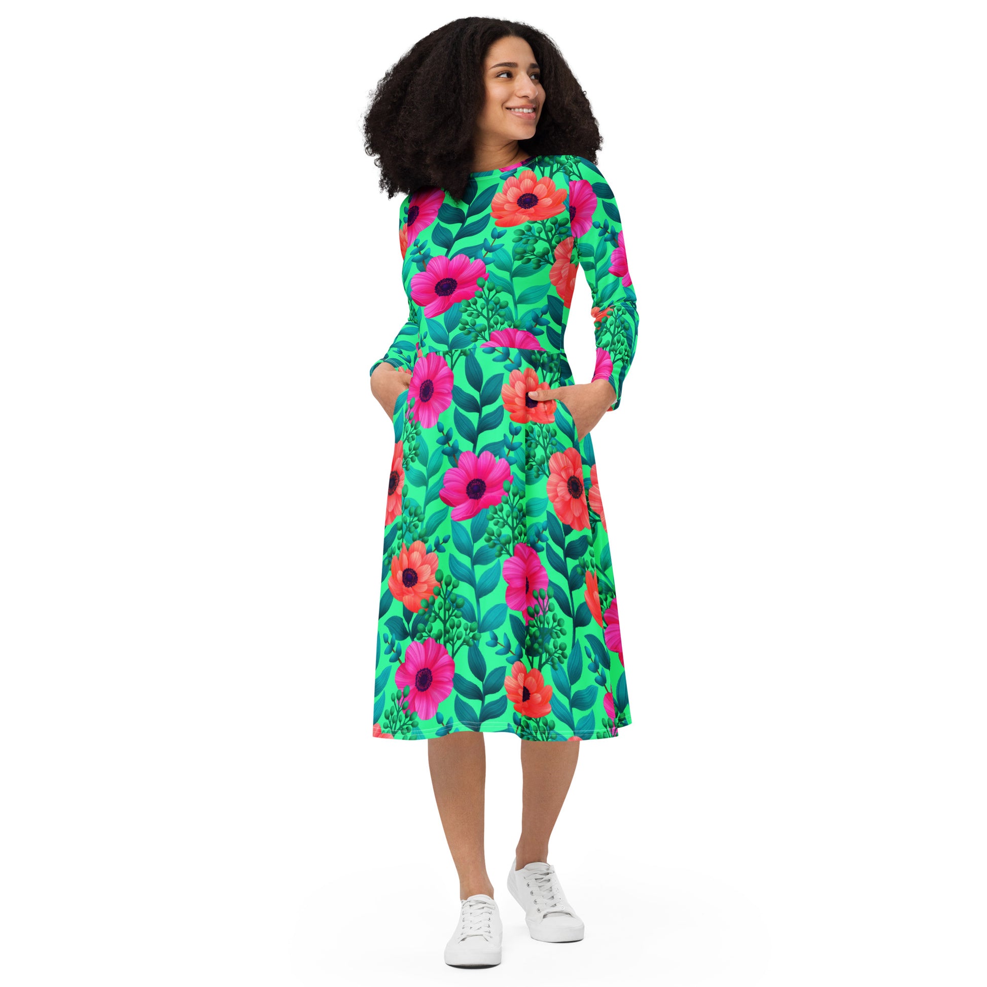 En klänning med långa ärmar OCH fickor? Ja tack! Denna långärmade midiklänning med all-over-tryck är en showstopper för alla som älskar att bära klänningar. Klänningen har en bekväm men ändå smickrande siluett eftersom den sitter i midjan och har en utsvängd nederdel. Styla den för en tjusig dag ute eller klä dig för en mer avslappnad look.